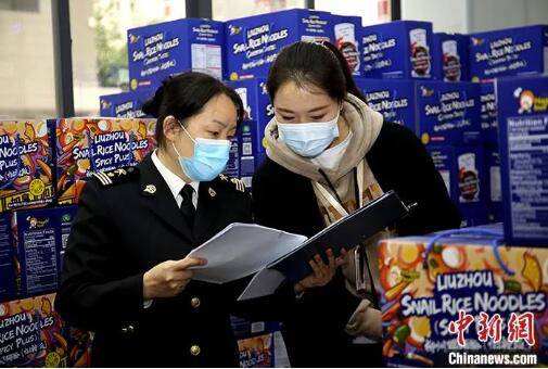 3月31日,由广西柳州市两家螺蛳粉企业生产的6.5万余袋预包装螺蛳粉,经海关检验合格将出口至美国、新加坡。中新社记者 朱柳融 摄