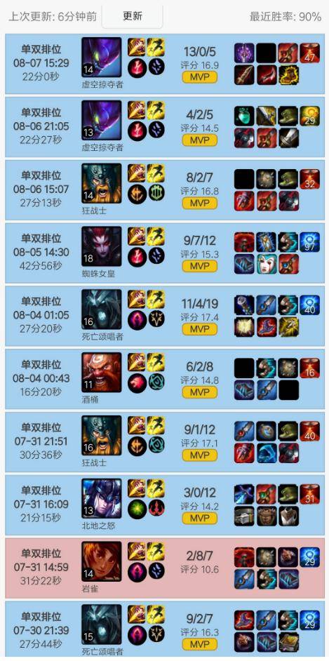 最近这段时间,Tarzan韩服rank局数并不多,勉强能够保证一天两局左右,但是才看到他的战绩的时候,确实有点恐怖,Tarzan最近的胜率也是达到了90%,并且最近还拿到了8连胜,但是胜率高并不可怕,可怕的是,MVP的次数,最近的8连胜,拿到了8次MVP,这确实有点恐怖,因为MVP首先要在比赛中的表现要好,而这只是其次,更重要的就是自己的KDA,和承受伤害占比,等等一系列的数据,而有的时候KDA好也并不一定能够拿到MVP,而这也不是最恐怖,更恐怖的则是他之前的战绩,MVP获得的几率高的惊人。