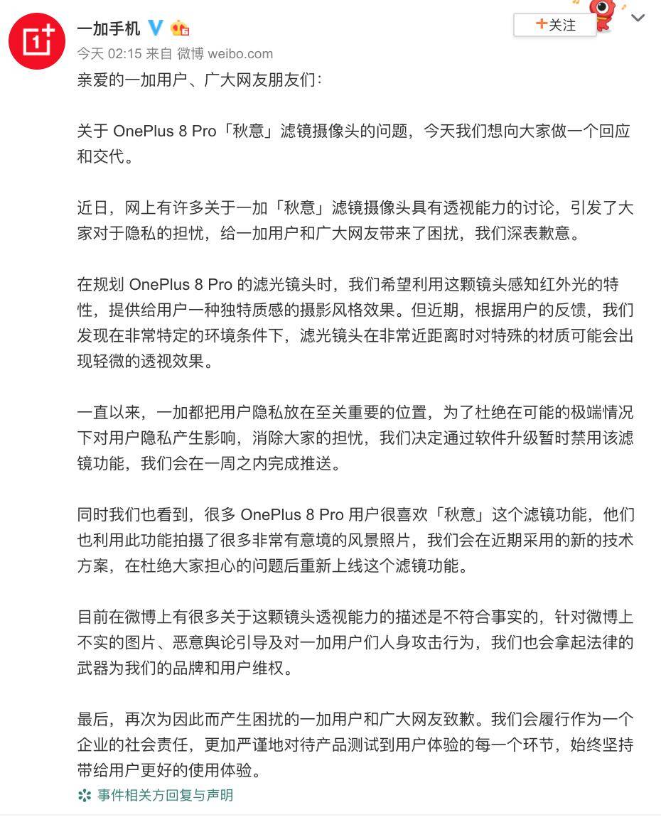 19日凌晨,“一加手机”微博就OnePlus 8 Pro“秋意”滤镜摄像头“透视功能”的问题进行了回应:深表歉意,决定通过软件升级暂时禁用该滤镜功能,会在一周之内完成推送。