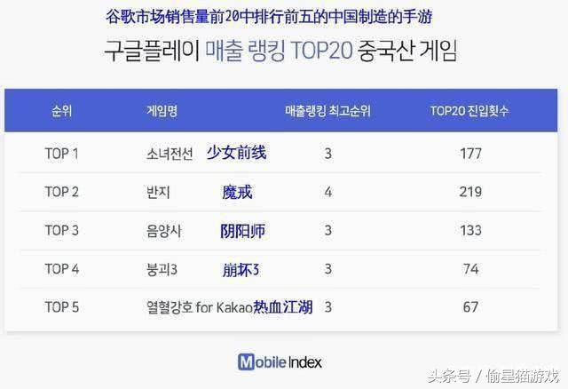 同样从数据上看,去年仅在韩国的Google上发布的中国手游就多达136款,游戏类APP占韩国谷歌商店营收的94.4%。畅销榜前20里,有16款是中国的手游,这16款游戏加起来的销售总额达到了11.6亿的人民币。