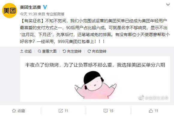 美团发微博称:“不知不觉间,我们小范围试运营的美团买单已经成为美团年轻用户最喜爱的支付方式之一,90后用户占比超六成。可就是名字不够响亮,显示不出‘这月花、下月还’,先享后付,还笔笔减免的排面。有没有哪位小天使愿意帮取个好名字?一经采用,999元美团红包奉上!!”