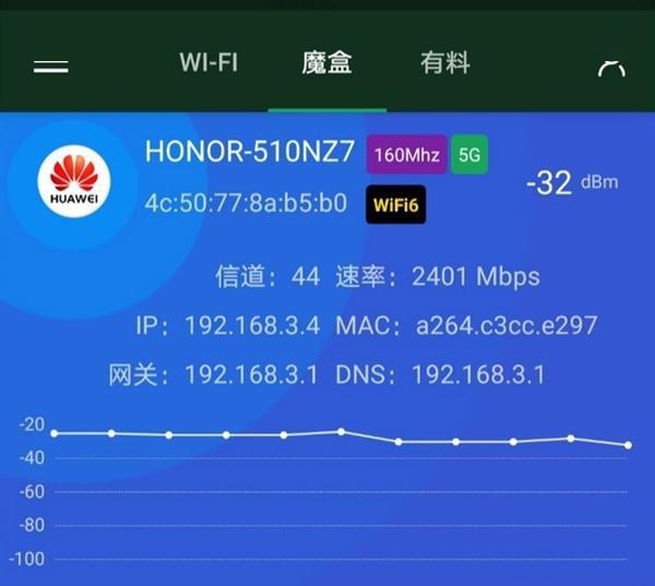 从测试的结果也可以看出,即使B点距离更远,隔墙更多,Wi-Fi信号强度却依旧能达到平均-20.2dBm。(dBm为一个指代功率的绝对值,为负值,这个值越大,表示信号越好,例如-20dBm要比-30dBm强度更高,信号更稳)