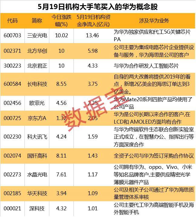 华为概念股19日走强,多家公司尾盘封住涨停板,如 三安光电、北方华创、共达电声等。141只华为概念股获机构资金净买入45.29亿元,仅三安光电就获得了13.46亿元的机构资金净买入,该公司为华为独家供应和代工5G关键芯片PA,19日成交量创近两个月新高。