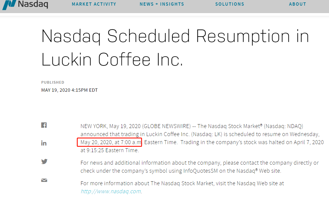 纳斯达克计划于美国东部时间5月20日上午7点(北京时间5月20日19:00)恢复瑞幸咖啡的交易。此前,纳斯达克在4月7日停止了该公司的股票交易。