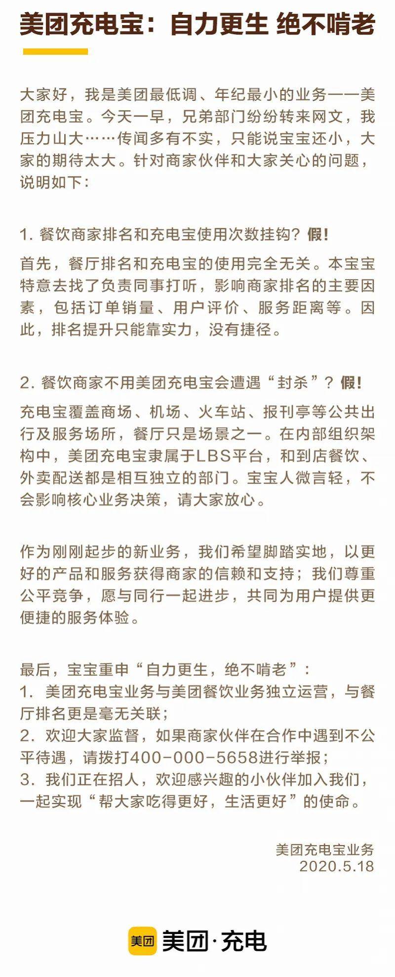 但这一策略被美团方面否认,在回复文中,美团充电宝业务部门自称“宝宝”,并强调新业务将独立运营,“自力更生,绝不啃老”。