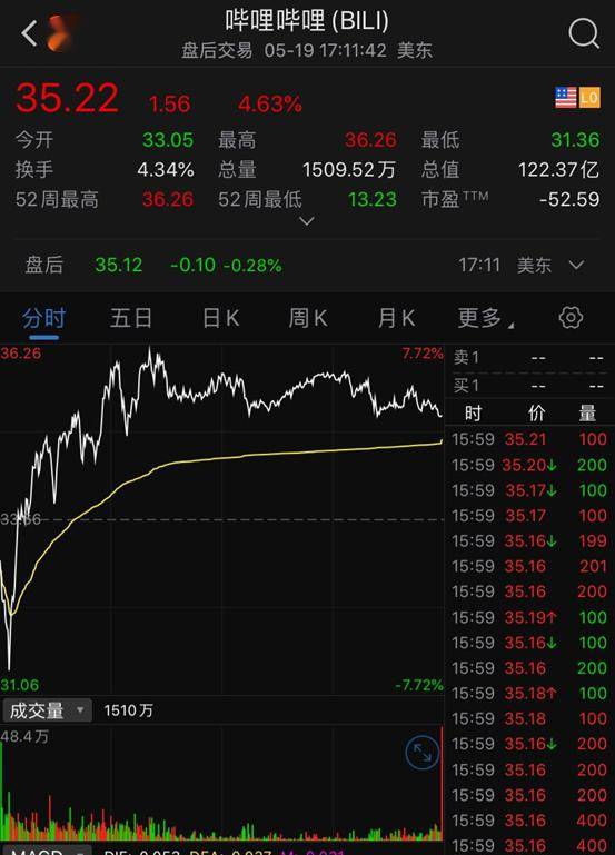 在开盘迅猛下跌7%后,B站的股价出现了快速反弹,并在盘中一度突破36美元,创下股价新高,与2019年的收盘价18.62美元相比接近翻倍。