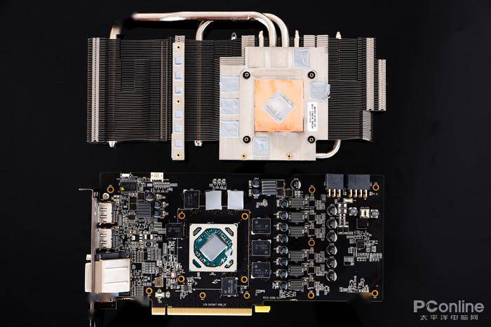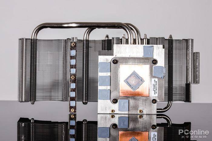散热模块方面,我们可以看到蓝宝石RX590 GME的用料是非常扎实的,两根8mm+两根6mm的热管,采用回流焊的方式与鳍片相连的,贴合效果更好,导热也更加迅速。
