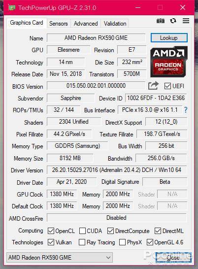 GPU-Z已经能识别出RX590 GME了,而核心规模也与RX590/RX580一模一样,32个ROPs单元,144个TMUs单元,像素填充率和纹理填充率略低于RX590同时也高于RX580 2048sp,核心频率也是介于那两者之间,就是RX 590的降频版(也就是青春版)。