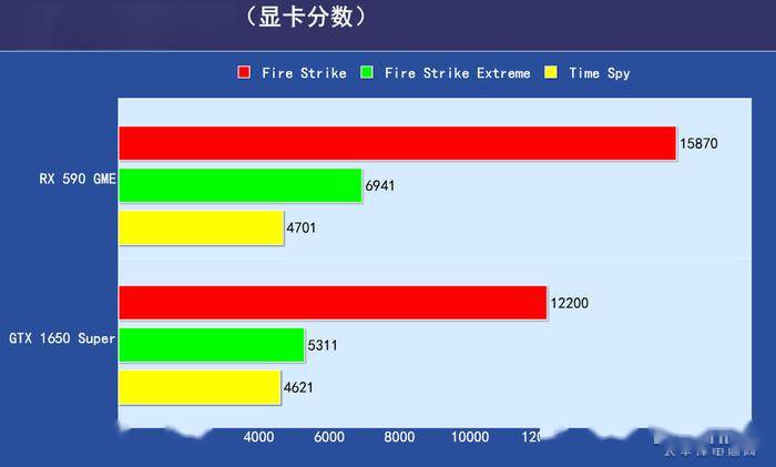 我们可以看到蓝宝石RX590 GME的显卡分数在三个场景中都是要高于GTX1650 Super的,在差距最小的Time Spy项目中,蓝宝石RX590 GME以2%的微弱优势领先GTX1650 Super,而在Fire Strike项目中蓝宝石RX590 GME有着30%的大幅度领先优势。