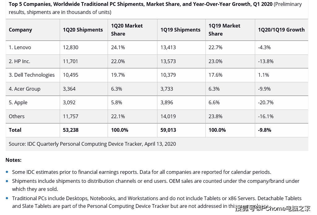 2020年第一季度全球PC市场报告(图片来源IDC)