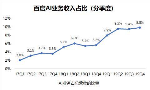 可这一占比已经是近年最高,2017年-2019年,AI业务收入在总营收中的占比分别为3.2%、5.5%、9%,不到10%。