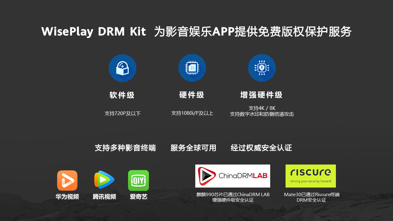 对于移动终端用户而言,观看流媒体视频成为了当下的一个常见应用场景。伴随着5G时代的到来,视频行业对数字版权管理(DRM)越来越看重。华为数字版权服务(WisePlay DRM),是华为基于ChinaDRM技术标准体系和全球最高DRM安全级别认证的SoC芯片,建立的华为自主端到端DRM解决方案,为开发者的影音娱乐应用提供内容的数字版权保护,包括硬件级与软件级的DRM能力,支持客户端证书在线申请,多种内容加密格式与加密算法,在线与离线播放等多种场景。华为自研麒麟990芯片组在隐私保护、安全等方面进行了周密部署,成为全球首个通过ChinaDRM增强硬件级安全认证的SoC芯片产品。