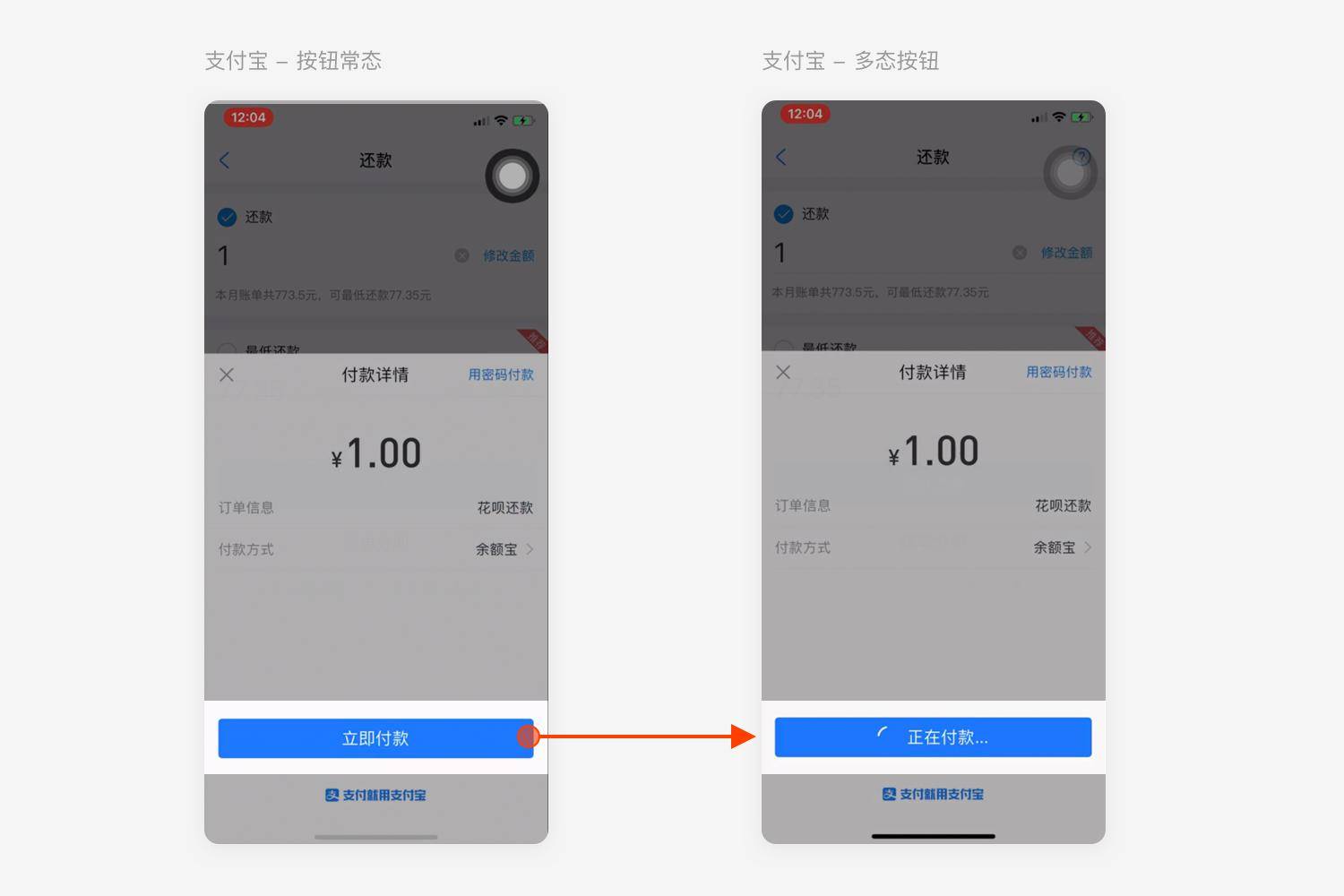 可能是我孤陋寡闻…第一个培养我多态按钮交互的应用是支付宝,但是多态按钮的诞生具体是哪里,这个不太重要,我就不在此做过多考究了。
