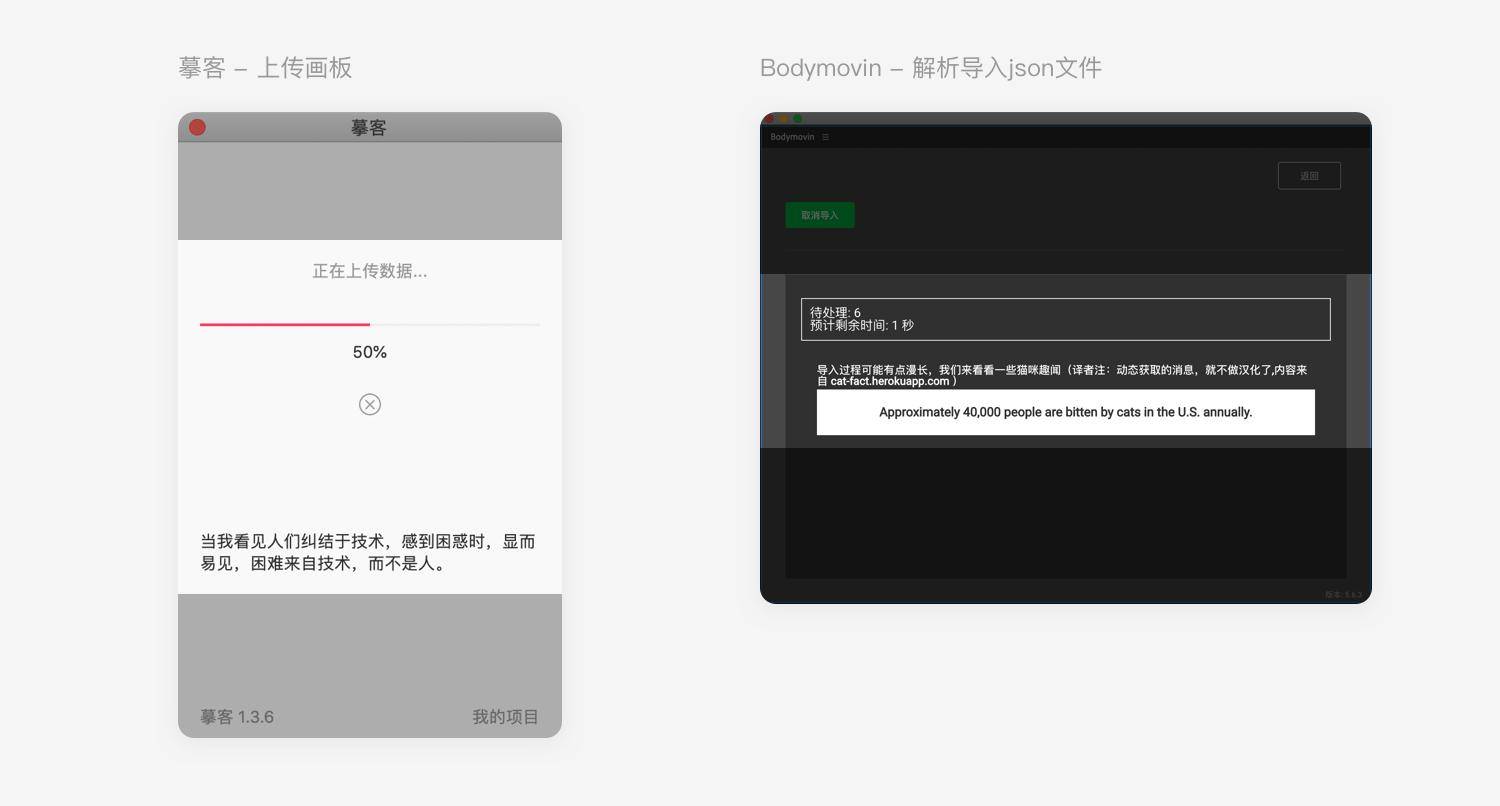 例如 PC 端惯用的手法,摹客在上传画板和 Bodymovin 在导入json文件时,都选择给用户随机发放名人名言或短新闻。