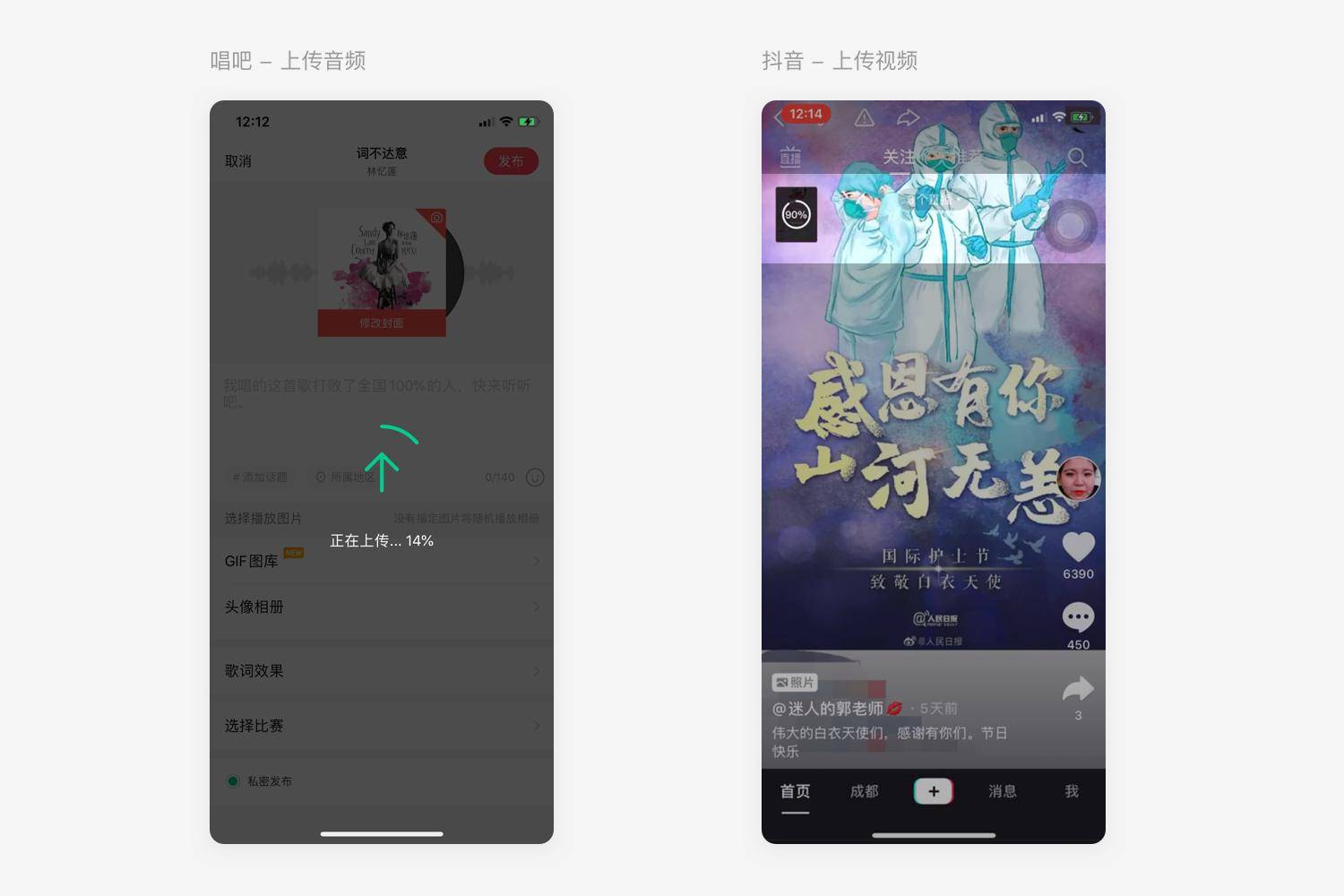 抖音有一个细节,在用户上传视频时,并不会让用户在当前页面瞎等,而是会让用户回到feed流页面,将上传浮窗放置在页面角落。