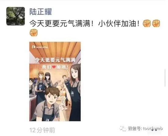 陆正耀先是发朋友圈,说“今天更要元气满满!小伙伴加油!”配图是一张瑞幸咖啡的海报。