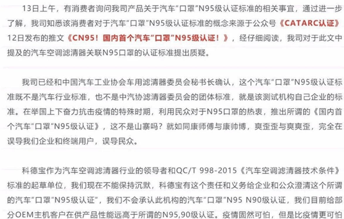 值得一提的是,科德宝作为不少汽车厂商的滤芯供应商,直接“跳反”,发布公开信批判“CN95”认证的权威性及可靠性。在公开信中,科德宝认为,由于应用环境不同、产品标准不同,华诚认证推出的CN95认证将汽车空调滤清器的过滤效率级别与口罩的N95防护级别关联,有“误导”企业和用户的嫌疑。戏剧性的是,随后科德宝删除《公开信》,并再次声明称,“文中无意否定目前市场上的高效滤清器对病毒的过滤能力,也并未对目前市场上若干汽车品牌所使用的抗病毒相关产品予以评判”。
