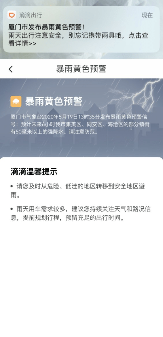 5月19日,滴滴向厦门乘客推送暴雨黄色预警信息