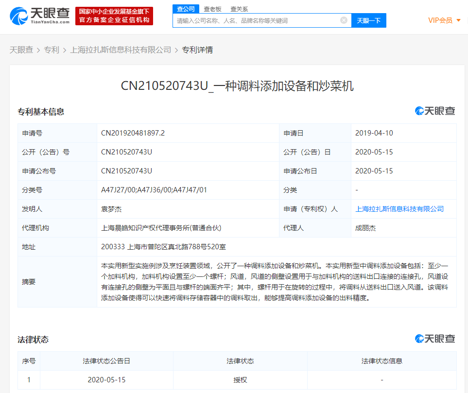 【环球网综合报道】天眼查专利数据显示,近日,饿了么关联公司上海拉扎斯信息科技有限公司新增授权专利,专利名称为“一种调料添加设备和炒菜机”。