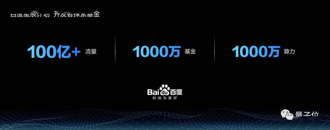 将以 100亿流量、 1000万基金、 1000万算力,支持广大开发者和百度一起参与到,用AI技术解决社会问题的理想和实践中。