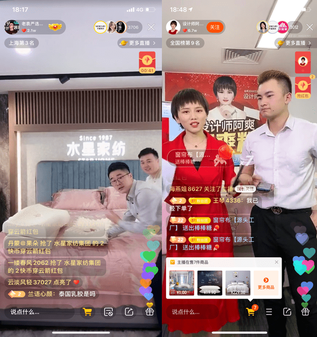 这种火爆延续到了“超级宠粉日”和“亲子节”活动。快手商家号与有赞客精选了包括“设计师阿爽”、“曾小贤严选”等30+位达人,通过实地逛店、探厂等方式将水星家纺优质产呈现给老铁。水星家纺董事长携高管与达人连麦PK直播带货,为老铁提供品质商品。