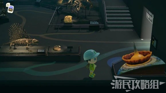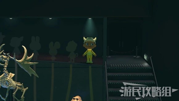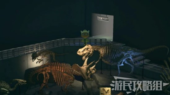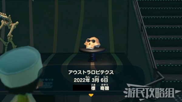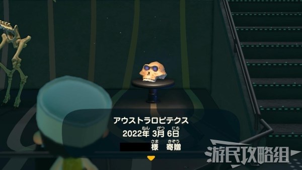 玩家角色站在合适位置(靠近玻璃即可)之后上方的聚光灯就会打亮。如果已经捐赠过的话,可以看到下方放的是古猿头骨,这里表示的是人类的进化链。