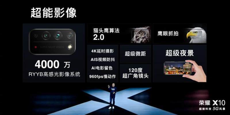 荣耀X10搭载4000万RYYB高感光三摄,搭配独家猫头鹰2.0算法,让拍照无惧黑暗。极限环境下,荣耀X10依然能拍出清晰的画面。除了暗光拍摄表现抢眼,荣耀X10还支持鹰眼级AI抓拍,能根据运动状态自动识别拍摄场景并进行追焦,可以做到”零“快门延迟,让用户所见即所拍。在视频方面,荣耀X10首次支持4K超高清视频拍摄,搭配HDR算法,逆光也依然清晰。
