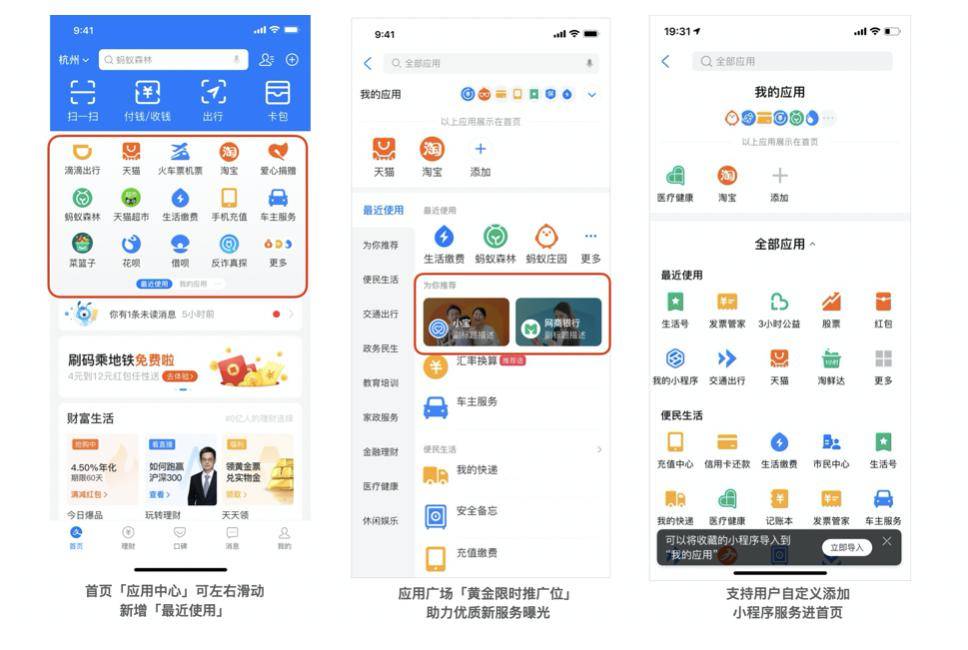 支付宝应用中心位于首页上方“宫格”,比邻扫一扫、收付款等刚需功能位,也是支付宝用户最常访问的服务区域,因此被支付宝称为“黄金位”。据了解,改版后应用中心首页展示位将分为“我的应用”和“最近使用”,从14个拓展至28个,这对提高第三方小程序服务曝光及用户粘性将是极大利好。