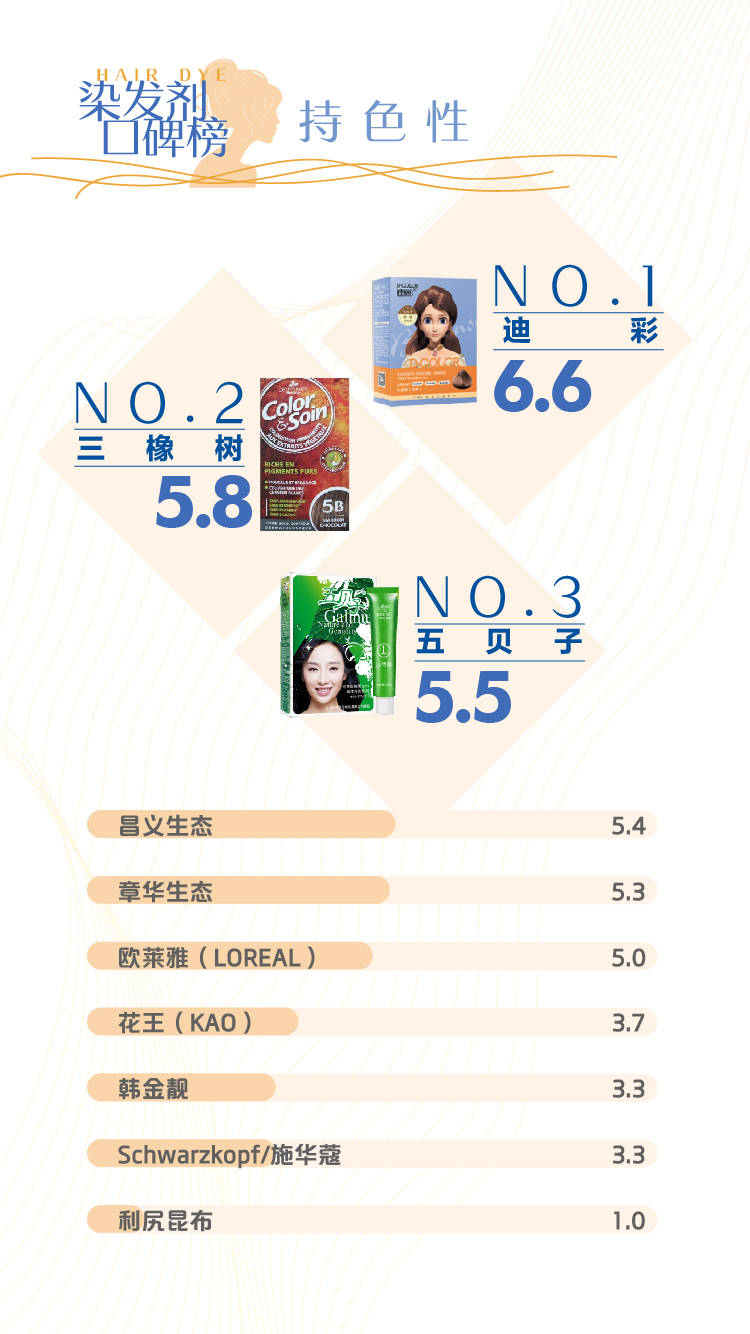 评论数据显示,迪彩(Decolor)持色性好评率66.36%,在10个品牌染发产品里好评度最高,有评论表示其“染后不掉色”,但仍有部分评论表示“掉色严重”。三橡树和五贝子以57.84%和54.55%的好评率分别位列持色度榜第二名、第三名。