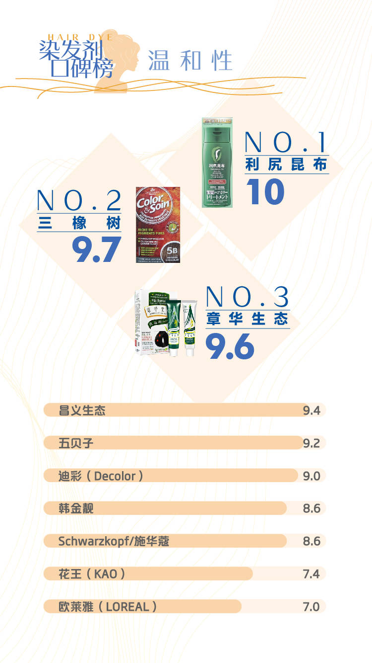 染发剂的气味是否温和、用后会不会过敏,是不少消费者在选购时关心的重点。在温和性这项指标中,各产品之间的好评率差异较大。其中利尻昆布获得满分好评率,在10款染发剂产品评价中位列第一,不少消费者表示该产品“无刺激、无异味”。三橡树和章华生态分别以96.89%、95.5%的好评率分列二、三位。