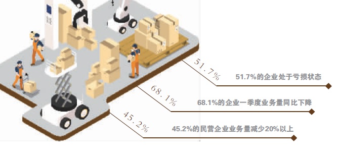 小微物流企业在疫情压力下,面临着更严峻的困境。《报告》显示,57.6%的企业反映出现亏损,亏损面超过行业平均水平,79%的企业业务量呈下降状态。
