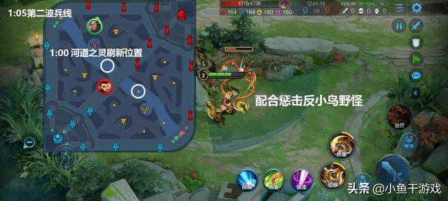 在经过中路河道的时候,我们可以顺便看看敌方野区的野怪情况,确定敌方是在哪边野区开,在蓝方就看3只野猪打了没有,在红方就隔墙看敌方蓝打了没有。如果对面是在发育路一边的野区开,就要在1分30秒左右,做好对面打野直接来抓自己的防备。