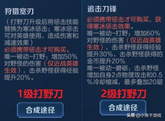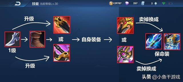 出装思路:1级出门直接购买小打野刀,出了草鞋之后,选择升级适合自身的2级打野刀,然后把相应的鞋子升级出来,再按正常出装把英雄自身的装备做好,根据自身需要看时机升级3级打野刀,到最后可以把打野刀卖掉换成自己需要的保命装。