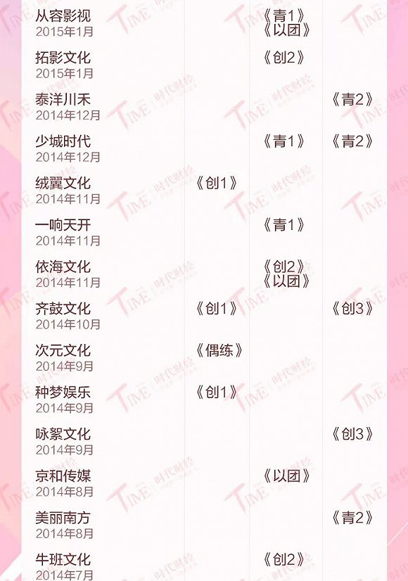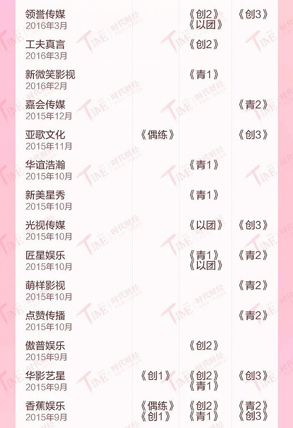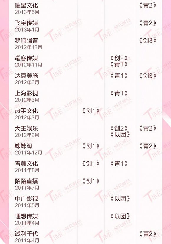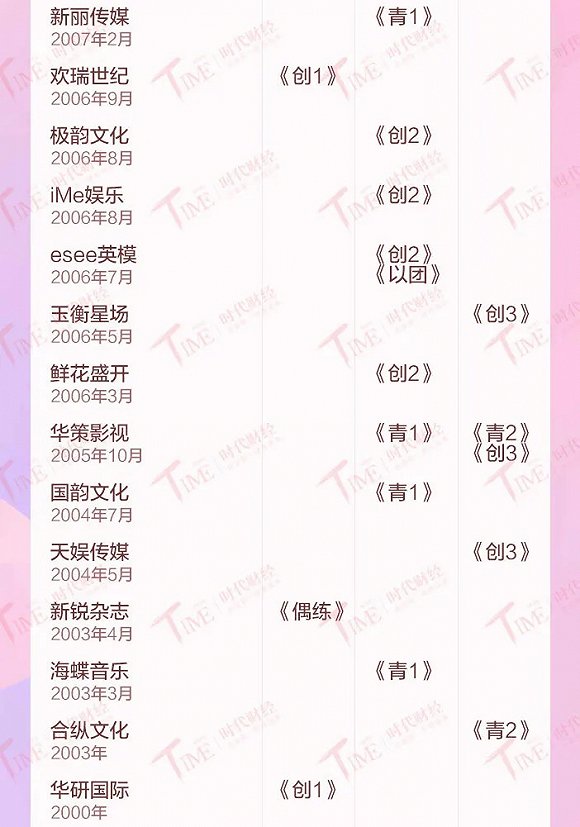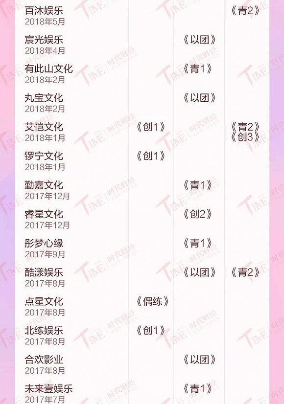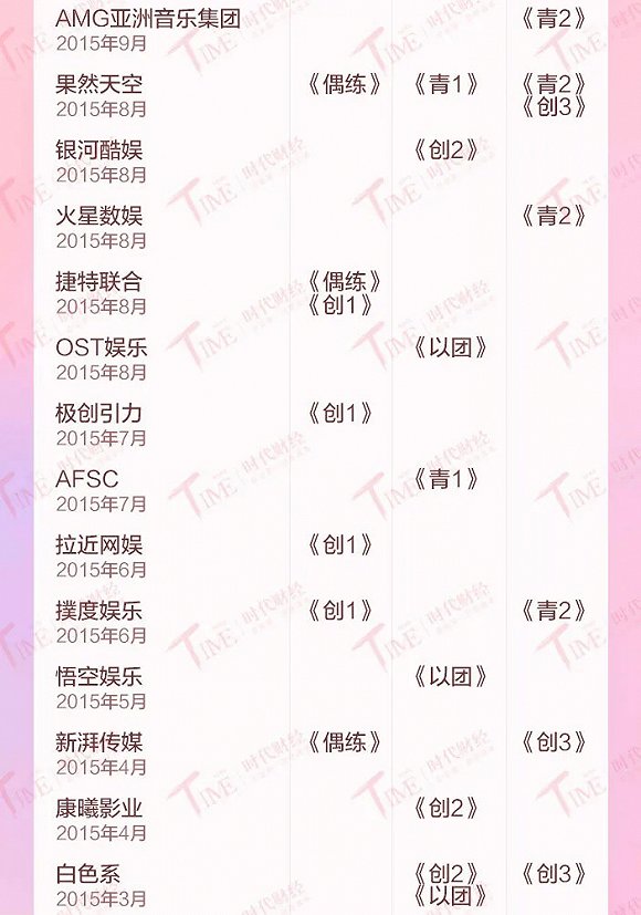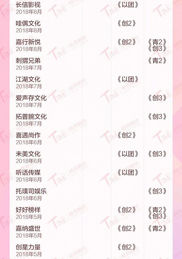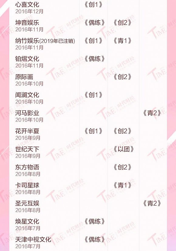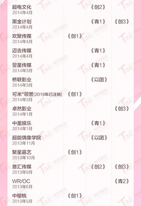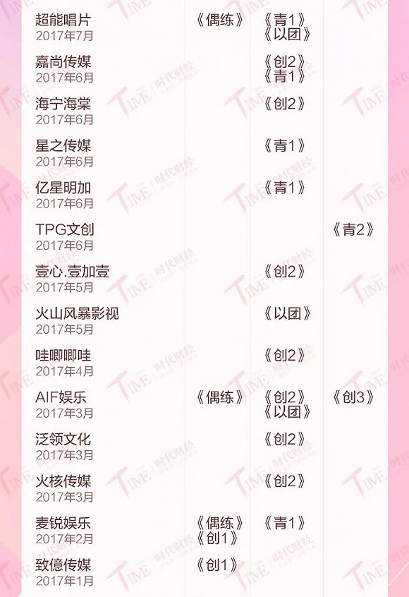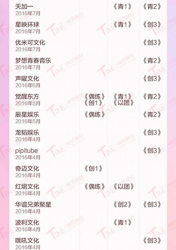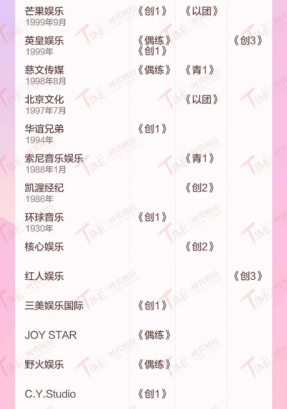 “青1”为《青春有你》;“青2”为《青春有你2》;“以团”为《以团之名》;“偶练”为《偶像练习生》;“创1”为《创造营101》;“创2”为《创造营2019》;“创3”为《创造营2020》