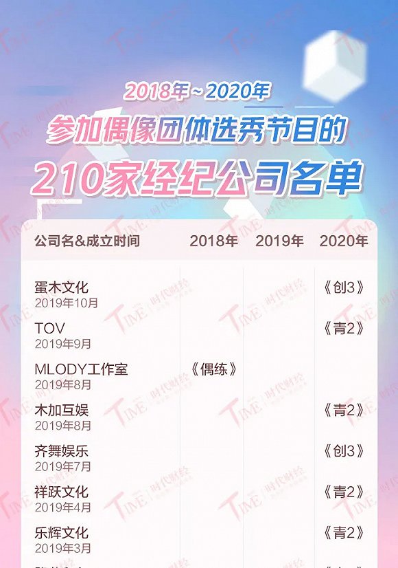 时代财经整理统计,算上2019年优酷推出的《以团之名》,2018年~2020年间参与这7档偶像选秀节目的经纪公司一共有210家。