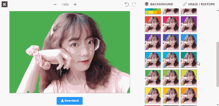 去好背景后的图片,可以直接下载(PNG格式),也可以点击旁边的“编辑”按钮二次编辑。Remove.bg提供了几种非常常见的二次编辑模板,包括一键换背景和一键换背景色。每种背景支持四种虚化程度选择。因此事实上,它可以瞬间生成几十种不同的图片风格。