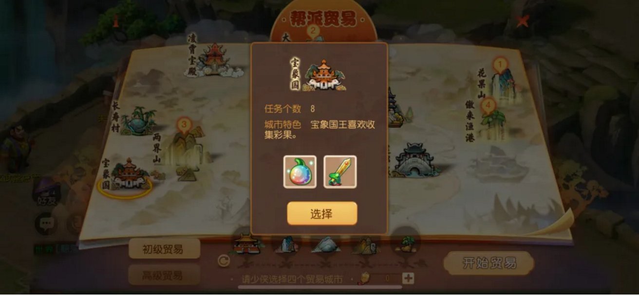 在初级贸易中,玩家可以使用帮贡兑换,或者参与帮派活动获取帮派锦盒快速完成初级贸易任务。而在高级贸易中,玩家则可以带上好友一同组队挑战劫商强盗,让全队赢得丰富奖励。在领取了帮派贸易寻物任务后,玩家还能将任务分享到帮派频道,交由其他帮派成员帮忙完成。