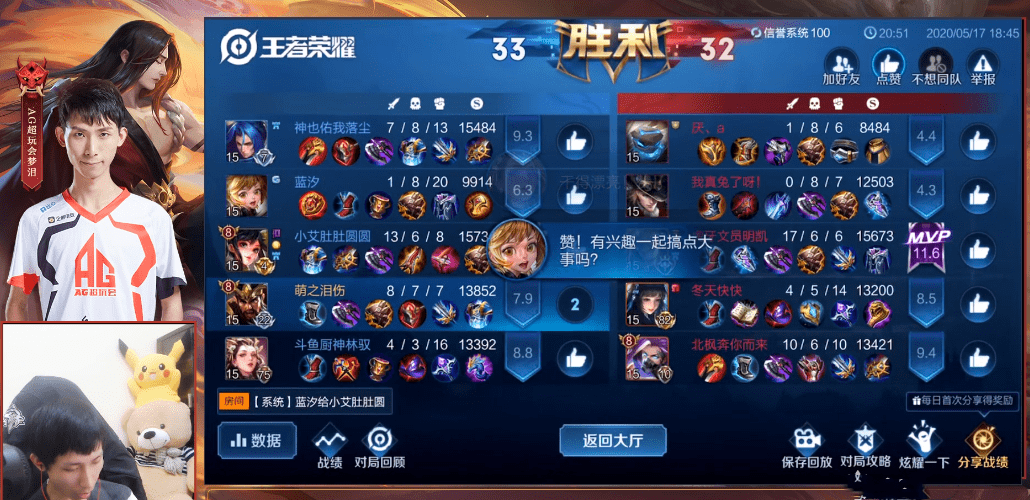 不得不说,梦泪这波出装实在太细了,有肉有输出的装备外加上抵抗之靴。在冲进去开团之前就已经估算好了对面的技能伤害,击杀对面核心位置后安全逃脱,且不用担心被对面一波结束比赛的情况。这波团战结束以后梦泪一方就逐渐稳住劣势,在后期的两波关键团战中大胜,一直接将对面水晶推掉,拿下了这场世纪大战的胜利。虽然梦泪最后评分仅仅只有7.9,但这局关羽的出色表现有目共睹,之所以能够翻盘成功就有那波团战以及前期对线期的很大功劳。