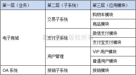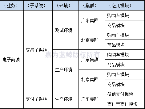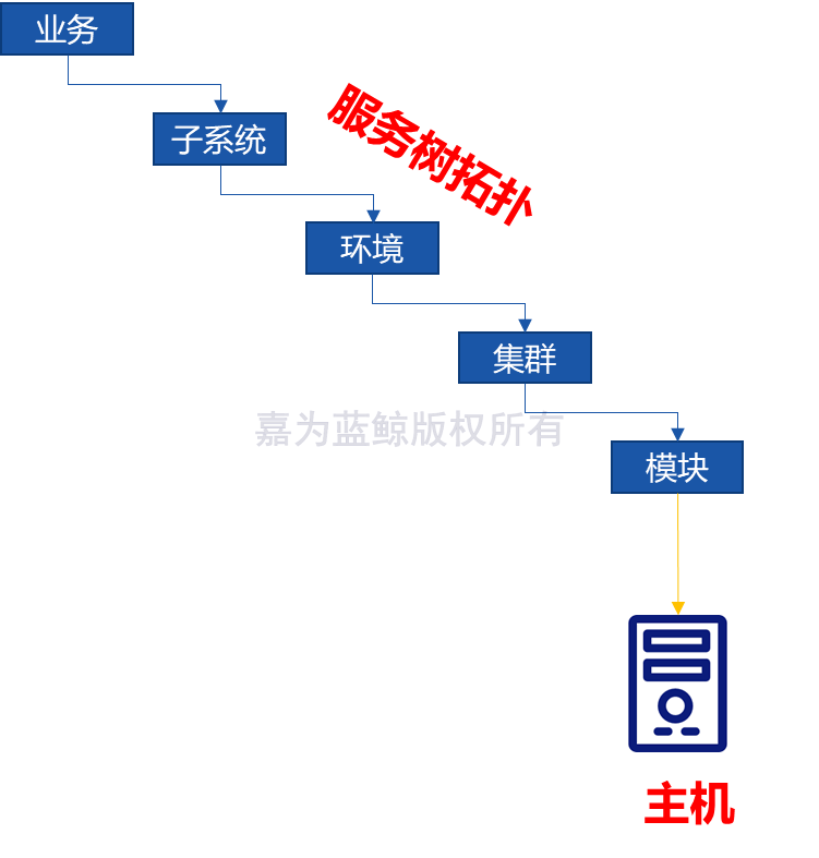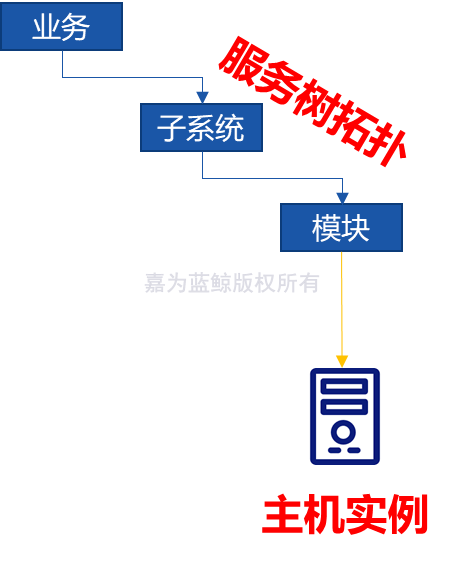 服务树拓扑主要是指从纵向的角度进行模块化划分,并把相同功能的模块划分到一个子系统中,服务树拓扑一般不要超过3层,最末端对应具体的应用模块,模块之下再是主机: