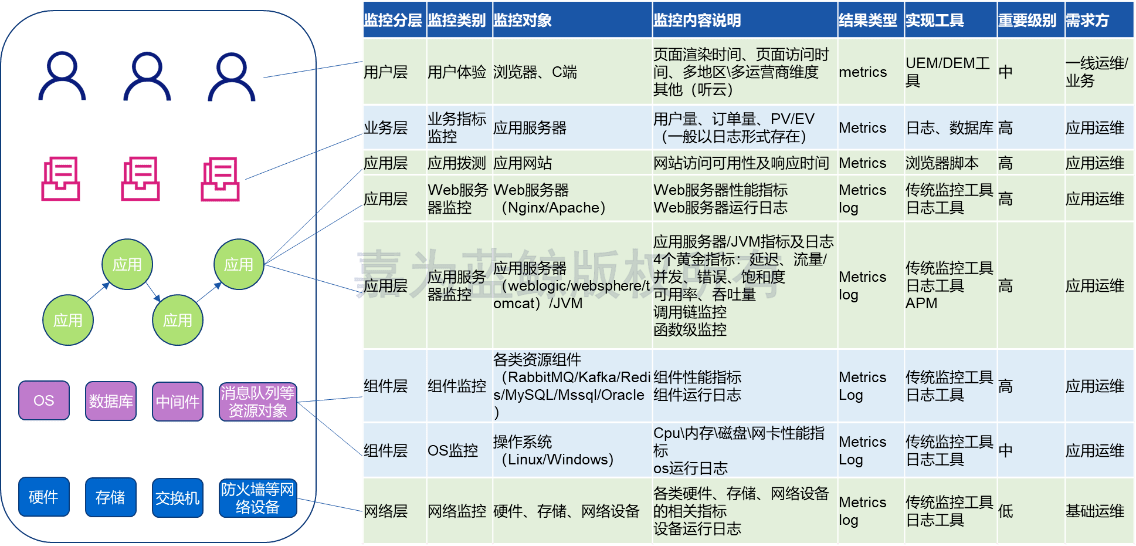 随着监控技术的不断应用,企业开始逐步建立立体化监控平台,所谓立体化监控平台,是指从多个维度对不同层级(一般从上到下划分为用户层,业务层,应用层,组件层,主机、硬件与网络层)的监控对象进行指标采集、统一存储和监控告警。立体化监控覆盖的对象范围如下: