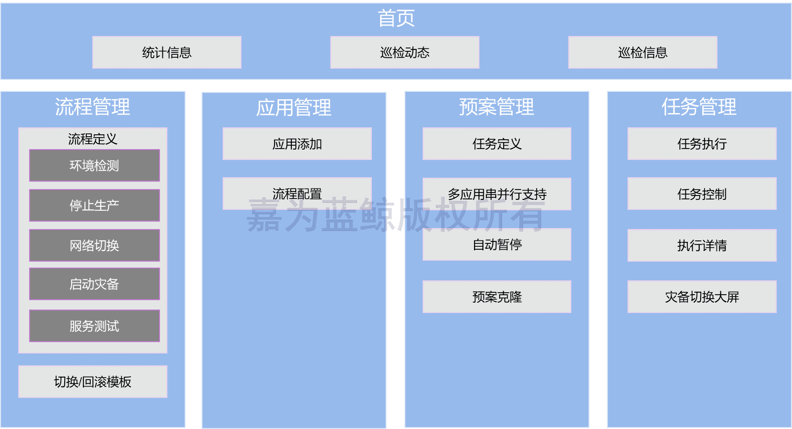 因此,一个好的灾备演练平台成为银行灾备系统建设完毕之后的迫切需求。一般来讲,灾备演练平台需要具备以下功能特性: