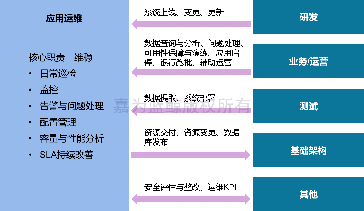 应用运维的核心职责在于确保应用系统高效稳定运行,同时响应研发、业务人员诉求完成版本变更或上线的业务价值交付,并提供相关的数据和服务给到业务、运营和测试等外部人员。应用运维团队的日常职责及与其他团队的工作交互简要如下: