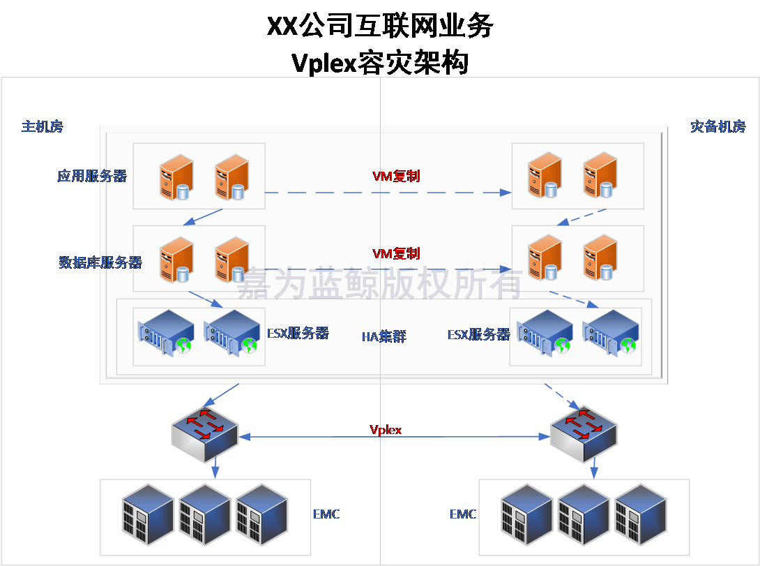 存储复制技术是银行灾备建设中常用的架构,以下是基于vplex和VMware HA集群的一种灾备架构设计(所有的虚拟机及数据文件均通过存储复制技术复制到灾备机房):