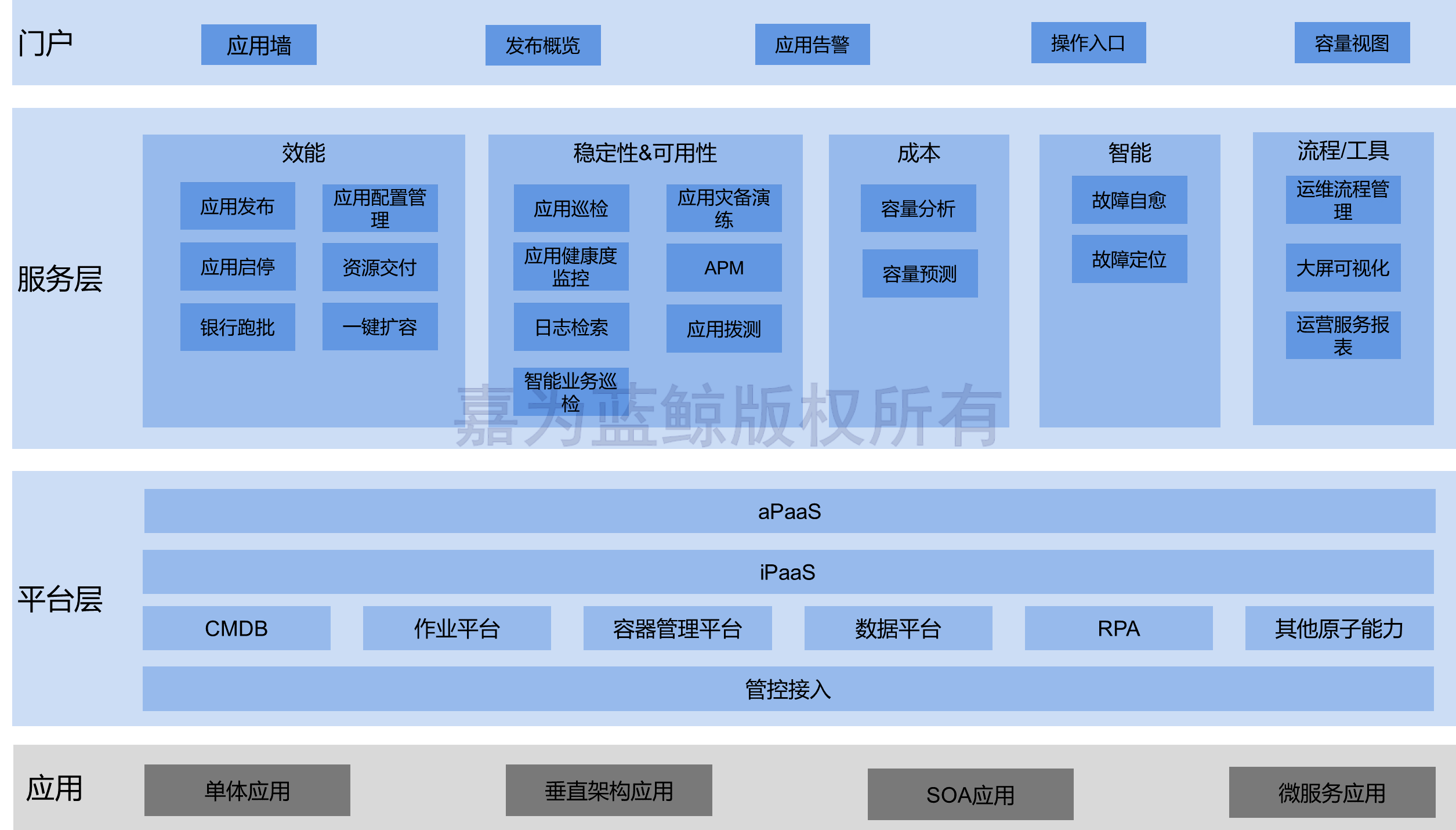 综上,要做好银行应用运维工作,需要建设一个支持双态架构的、可扩展的、先进的、能促进组织转型而自增长的应用自动化运维平台。