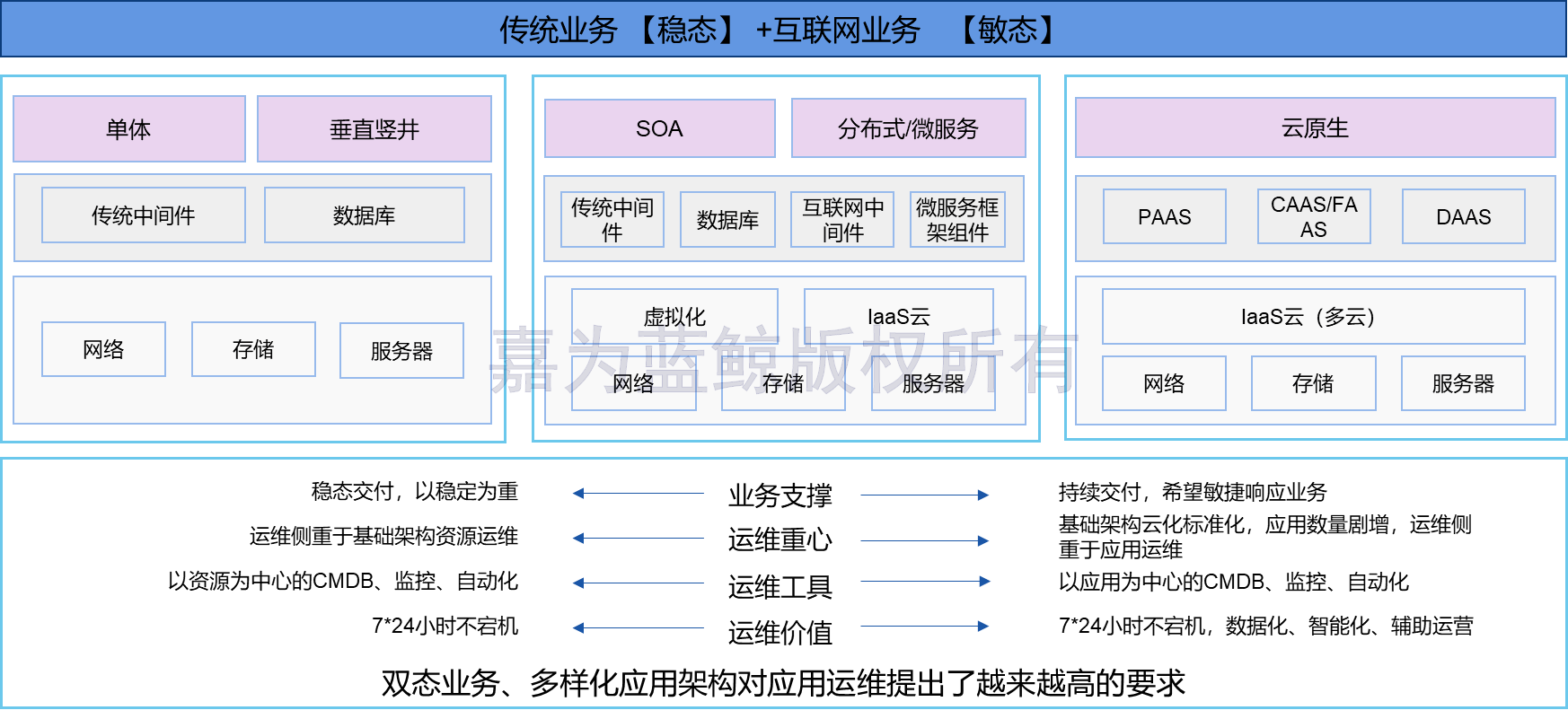 而对于银行IT运维来说,不同架构的业务系统,对运维的能力和侧重点要求并不同,运维的要求、难度和压力也在不断的增大。