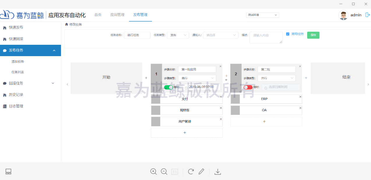 银行在有限的发布窗口中进行应用发布时,有时会涉及到对大型应用进行批量发布,此时应用模块之间的发布顺序是需要严格定义的,包含每批应用发布的时间设定等,此时就需要提供应用间、应用内主机间的串并行发布顺序编排能力。