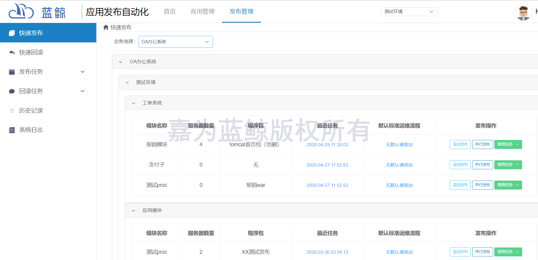 应用发布需要基于CMDB和应用配置管理之上进行构建,将应用的各种对象资源及发布对象管理起来后,自动化发布就成为一个简单的事情了,我们可以选择任何一个模块按照一定的策略(并行、滚动、分批等)进行快速的发布:
