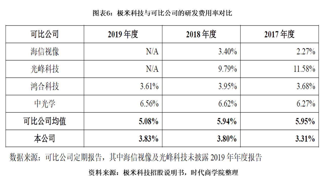 招股书显示,极米科技是研发驱动型科创公司。但2017—2019年,其研发费用分别为3305.08万元、6300.17万元和8106.09万元,占营业收入比例分别为3.31%、3.8%和3.83%,均低于可比公司均值。