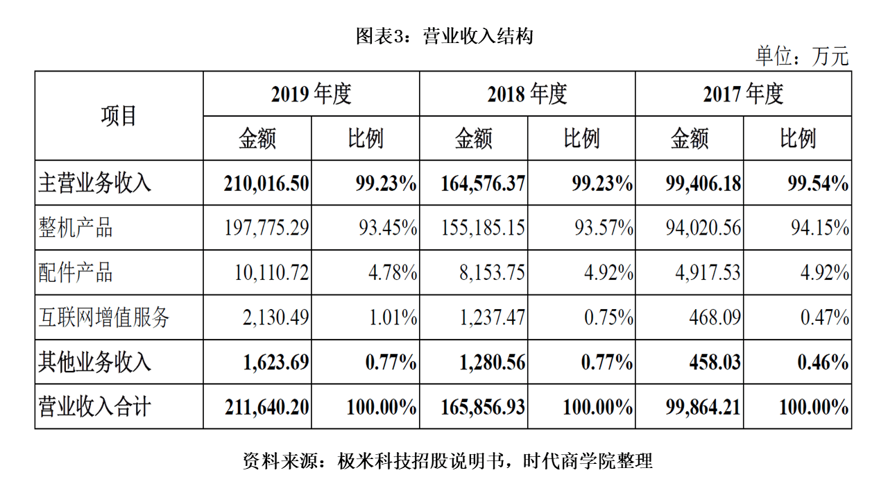 招股书显示,2017—2019年,极米科技营业收入分别为99864.21万元、165856.93万元和211640.20万元,报告期内复合增长率为45.58%。其中,主营业务收入占比均保持在99%以上。对营收贡献最大的是整机产品,2017—2019年整机产品收入占营业收入比例分别为94.15%、93.57%和93.45%。