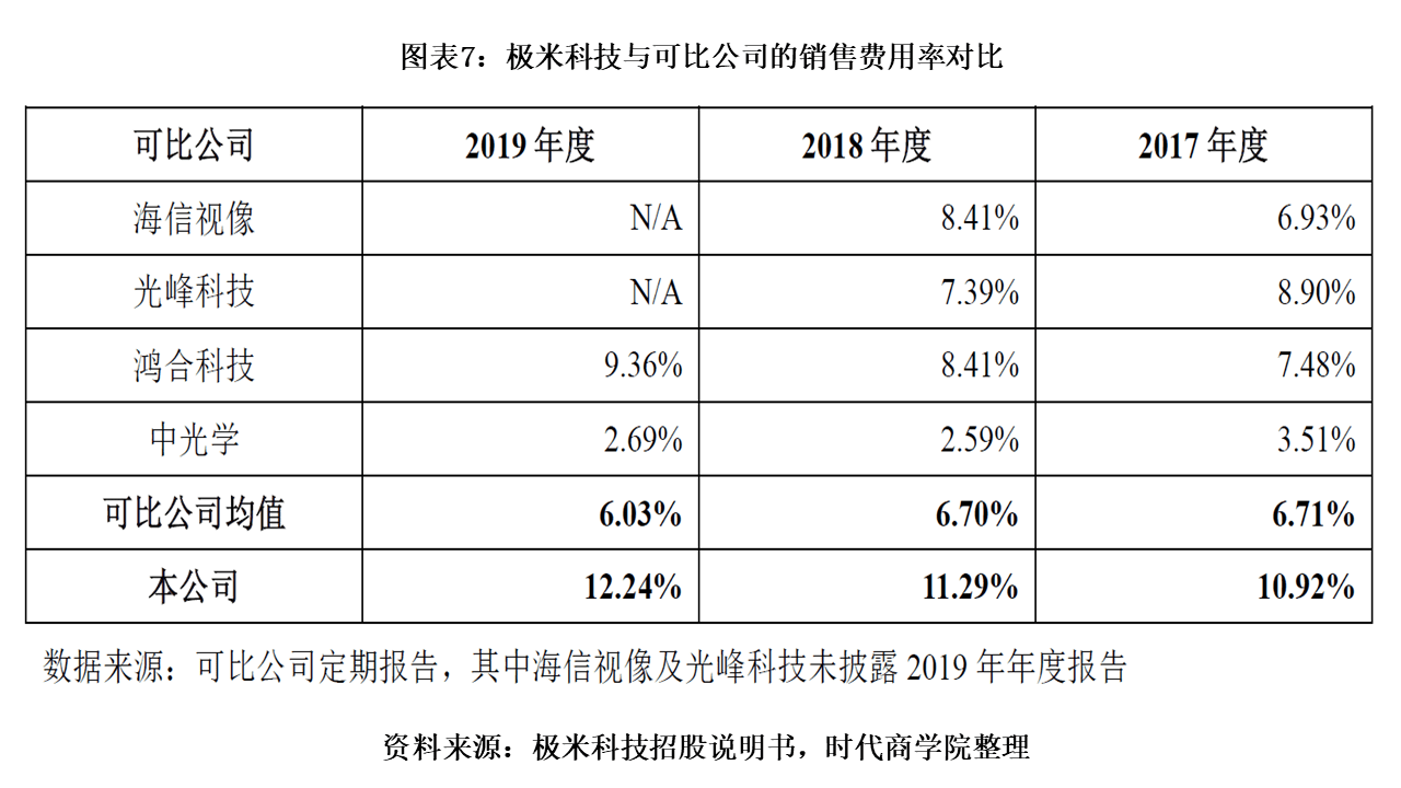 招股书还透露,2017—2019年,该公司销售费用率分别为10.92%、11.29%和12.24%,远高于可比公司均值,2019年几乎是可比公司均值的两倍。